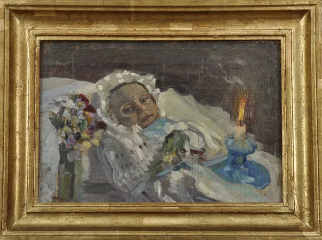 Obra de formato rectangular. Composición en base a paisaje rural. En primer plano un monte con pastizal de color verde y un camino al centro, este va en diagonal ascendente de derecha hacia el centro de la composición. En segundo plano, al centro la figura de tres niñas, una de ellas de pie y medio perfil, lleva vestido de color café, delantal y gorro de color blanco, en su brazo derecho sostiene una cesta. A la derecha, recostada en el césped, la que lleva vestido de color gris claro, con delantal de color blanco y un lazo en el cabello de color rojo. Luego la tercera niña, sentada en el césped, la que lleva vestido de color celeste. En esté mismo plano a la izquierda un portón dos árboles, de los cuales se observa sólo el tronco y arbustos de color rojo y verde. Al fondo se observa una ruca de color café y el cielo nuboso en tonalidades grises.