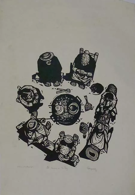 Posible representación de escenografía industrial. En la parte inferior a la izquierda, se distinguen las siluetas de una serie de edificaciones alzadas sobre lo que parece ser una colina; y a la derecha, se visualiza una serie de chimeneas humeantes. En la parte superior, se alza un cielo iluminado en el centro, y más oscuro en los extremos, en donde se observan corrientes de viento que van desde el extremo superior izquierdo hasta en costado derecho de la obra, llevándose el humo de las chimeneas.