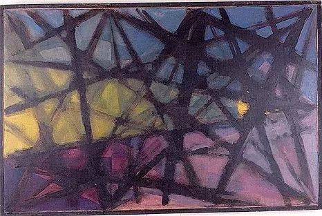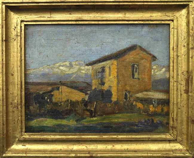 Obra de formato rectangular. En primer plano una casa de color amarill...