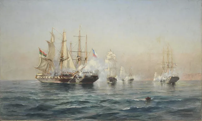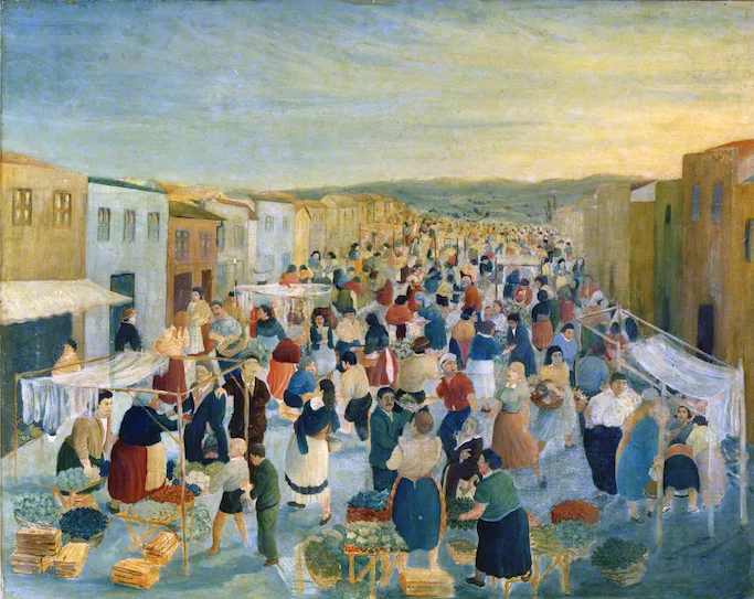 Obra de formato rectangular, horizontal. Composición en base a un grup...
