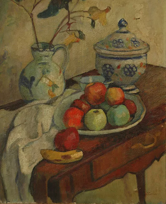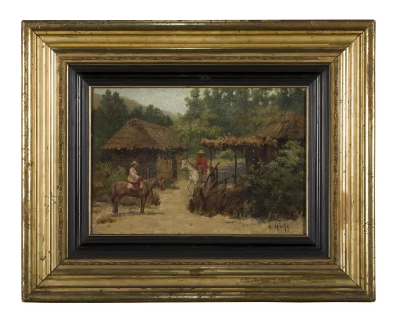Obra de formato bidimensional con elementos sobresalientes, rectangular y orientación vertical. En el extremo superior lleva adherido horizontalmente un esquí de madera de fijaciones metálicas, con un extremo doblado sobre sí mismo en forma de U, pintado con motivos de camuflaje militar en parte de su superficie. La obra muestra distintos elementos representados en la tela, más abajo del esquí, hacia la izquierda, un sombrero negro flotando, hacia la derecha se observa el tronco inferior de un hombre desnudo, visto desde un costado, tendido sobre una banca de color blanco. En una de las patas de la banca se muestra el rostro de una mujer de cabello castaño, que lleva un pendiente colgante de color negro, y que mira al espectador. Hacia la derecha un cráneo humano. Más abajo se muestran dos cabezas de gallina idénticas con una línea diagonal que corta la sección de la cabeza. Hacia abajo, se observa un caballo de color marrón que mira hacia la izquierda, mostrando su cabeza y parte de sus dos patas delanteras. Sobre su lomo se perfila una forma irregular pintada como piel de leopardo. Hacia la derecha, se muestra el rostro de perfil de un hombre de raza negra con barba, con camiseta de cuello de color azul, que mira hacia la derecha. En un recuadro ubicado en la zona inferior izquierda, se observa una mano izquierda apuntando con el dedo índice hacia el caballo y bajo el recuadro unas manchas de pintura chorreada de color rojo. Finalmente, hacia la derecha, se representa un sofá de dos cuerpos de color negro. Todo sobre un fondo de múltiples colores opacos difuminados, tales como negro, morado, naranjo, azul, verde y marrón.