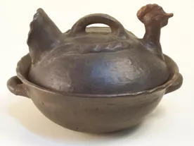 Fuente circular con dos asas, cuya tapa es una gallina echada estiliza...