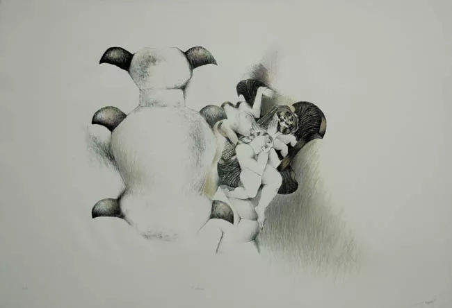 Obra de formato rectangular. Composición en base a busto de figura femenina de medio perfil izquierdo, con mano izquierda sobre la cabeza, viste traje sin mangas y lleva cabello liso a la altura de los hombros.