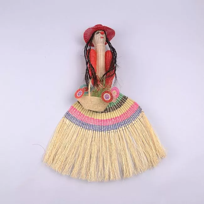 Objeto decorativo. Boca mas ancha que la base y un asa superior que consiste en dos hebras entrecruzadas. Esta decorado con franjas de color rosado y amarillo. Elaborado en una estructura de raíz sobre la cual pasa el tejido de crin previamente teñido.