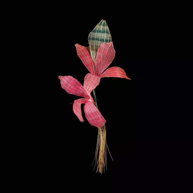 Modelo a escala de una embarcación sencilla. Objeto de forma oval alargada, con los extremos apuntados y curvados hacia arriba, y base plana. Se encuentra decorado con cuatro amarres de fibra vegetal en los bordes. Está elaborado en madera tallada y perforada de color marrón claro.
