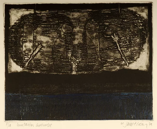 Obra de formato rectangular, primer plano color azul obscuro, segundo ...