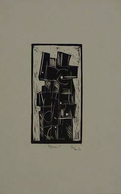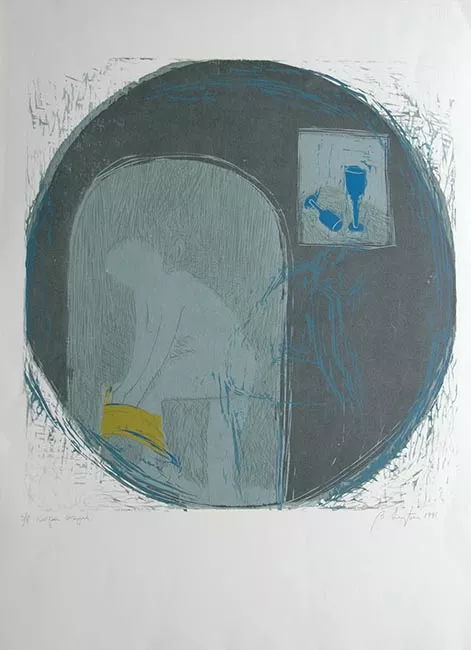 Obra rectangular, orientación vertical. Composición en base a personajes con cuernos en el hocico y vestimenta circense. Se distinguen también algunas figuras masculinas en segundo plano y al fondo un tubo visto en perspectiva y un trapecista. Composición en tonos naranjos, amarillos y negros.