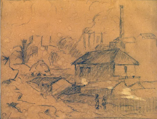 Obra de formato rectangular en orientación horizontal. Dibujo figurativo, monocromático, que representa dos estudios de plantas. Ambas con bases de tronco sólidos y hojas alargadas prominentes. Fondo blanco.