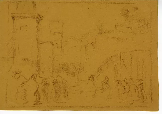 Obra de formato rectangular, horizontal. Composición monocromático en ...
