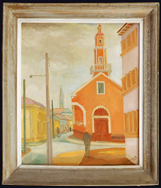 Obra de forma rectangular. Composición en base a un paisaje urbano. En...