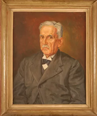 Retrato de medio cuerpo de personaje anciano con bigote y cabello cano...