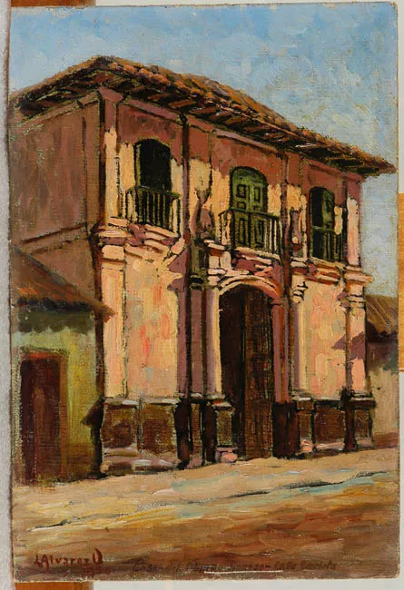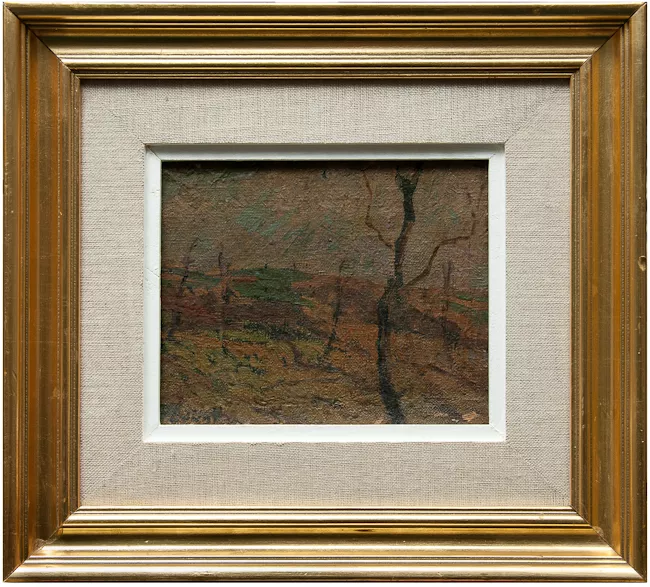 Obra de formato rectangular. Composición en base a paisaje rural. En...