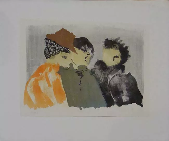 Obra de formato rectangular en orientación horizontal. Grabado policromático, semi-figurativo que representa una estructura de color rojo con segmentos cuadrados donde se representan detalles de rostros. A la derecha, una figura vertical como cinta de película en color negro. Fondo blanco.