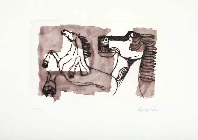 Obra de formato rectangular en orientación horizontal. Grabado figurativo, policromático que representa dos pequeños personajes con figura antropomorfa al centro de la composición. Ambas figuras, sólo con extremidades inferiores y cuerpos achatados, tienen sombreros negros. Fondo blanco.