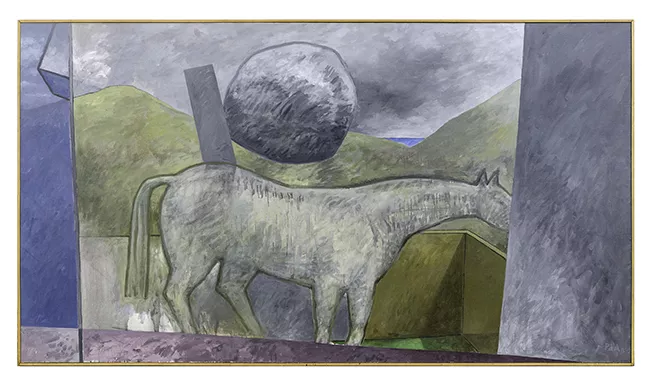 Obra rectangular, orientación horizontal. Línea del horizonte en la sección central de la obra. Composición en base a lomas en tonos verdes. Al fondo, sector izquierdo se distinguen algunos árboles. Cielo en tono gris.