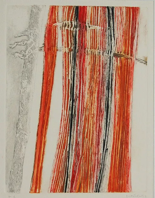 Obra rectangular, orientación vertical. Composición semi abstracta, se...