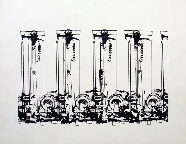Obra de formato rectangular de orientación vertical (Dimensión de la imagen 49,2 x 34,7cm). Grabado abstracto, al centro de la obra una figura abstracta de tonalidades marrón, a sus costados el color de fondo es negro mientras que la zona superior de la obra se mantiene en color blanco.