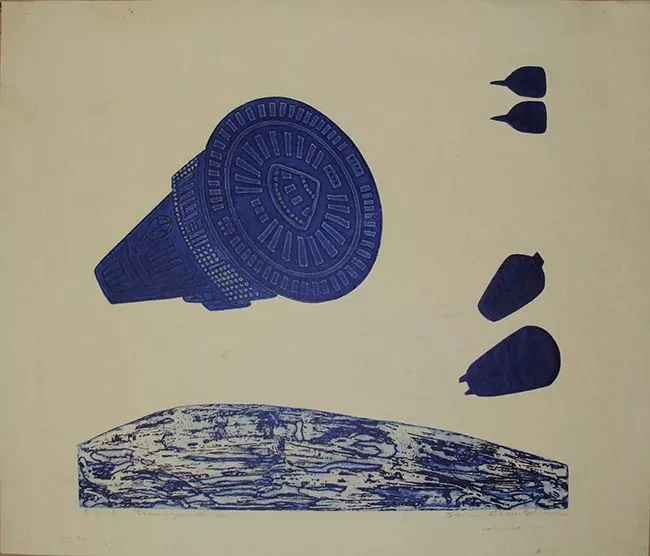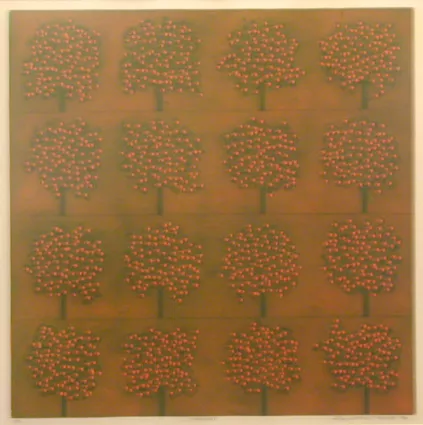 Obra de formato rectangular de orientación vertical (Dimensión de la imagen 49 x 35cm). Grabado abstracto, al centro de la obra, una especie de rectángulo deforme con manchas y texturas internas de colores tierra. El fondo de la obra está dividido por una línea de horizonte elevada y curva, cuya zona inferior presenta un degrade descendente desde tonalidades verdosas a negras y la zona superior es color negro.