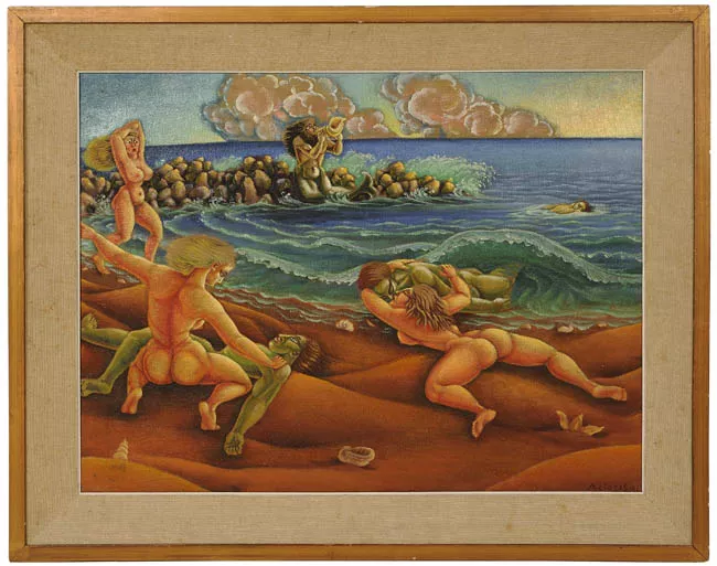 Obra de formarto rectangular. Composición en base a una marina. En pri...