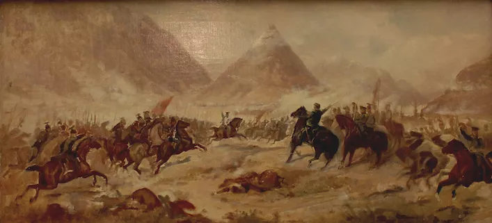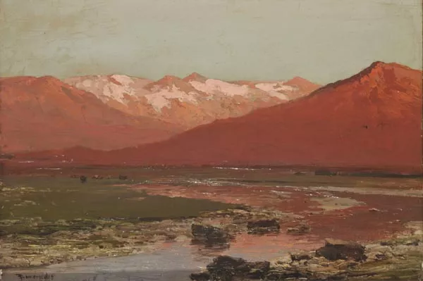 Formato rectangular, composición horizontal en exterior. Paisaje con m...