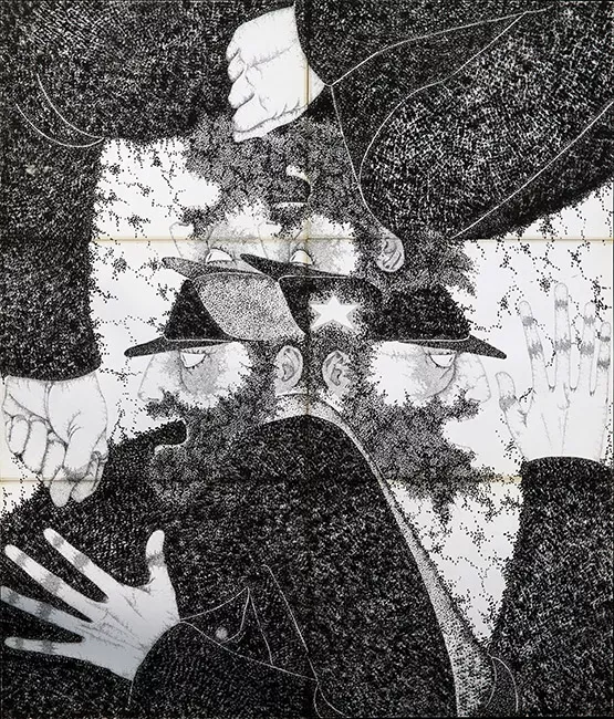 Dibujo monocromo en base a líneas que representa una hilera de tres pe...