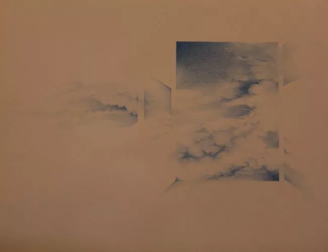 Obra de formato rectangular y orientación horizontal. Composición en base a grupo de figuras humanas jugando al ajedrez. A la izquierda hay cuatro figuras de perfil observando un tablero que extienden sus brazos y tienen peones en sus manos. A la derecha, una figura de perfil con bigote y gafas en igual posición. Detrás de esta se observa la silueta de otra figura. Al centro y sobre todas las figuras se extiende un tablero de ajedrez ondulado con nueve fichas sobre su superficie. En la parte superior, seis círculos que representan el ciclo lunar. Las figuras son todas calvas. La obra está realizada con delgados trazos negros y series de líneas entrecruzadas en mayor o menor medida que le otorgan variaciones de grises.