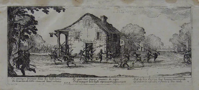 Obra rectangular, orientación horizontal. Escena de saqueo. Campesinos...