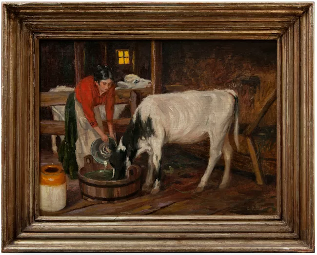 Obra de formato rectangular. Composición en base a escena al interior ...
