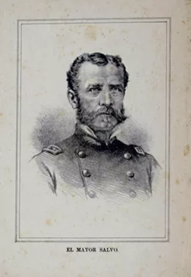 Busto de personaje masculino barbado. Lleva traje militar con charrete...