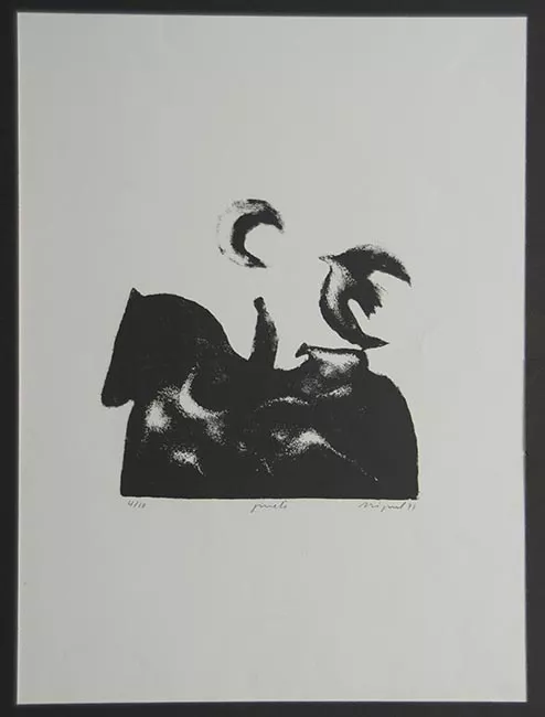 Obra de formato vertical en orientación horizontal. Grabado semi-figurativo que representa tres figuras humanas en una hilera; a la izquierda, un hombre con sombrero y camisa amarilla, le sigue un hombre de boina y chaqueta verde, mientras el tercero tiene pelo rizado, corto y un abrigo oscuro. El fondo del grabado es blanco.