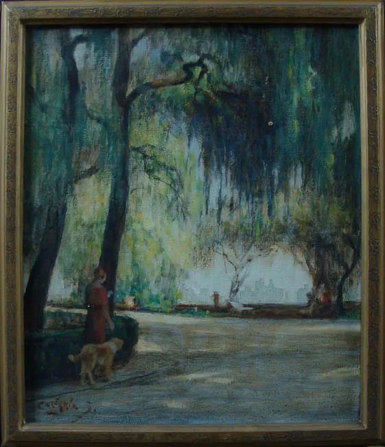 Obra rectangular, orientación vertical. Vista de un parque con la líne...