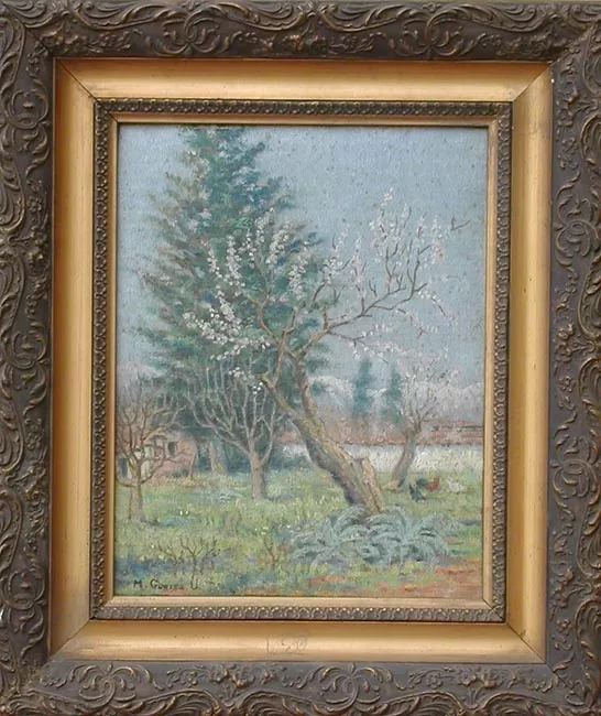 Obra bidimensional, rectangular, orientación horizontal. Línea del horizonte en la franja central de la obra. Composición en base a calle de campo vista en perspectiva. A los costados de la calle se distinguen muros bajos, sobre ellos asoman árboles con flores rosadas y follaje verde. Al fondo de la calle se distingue construcción con una torre que culmina en una cruz. Cielo en tono morado y blanco.