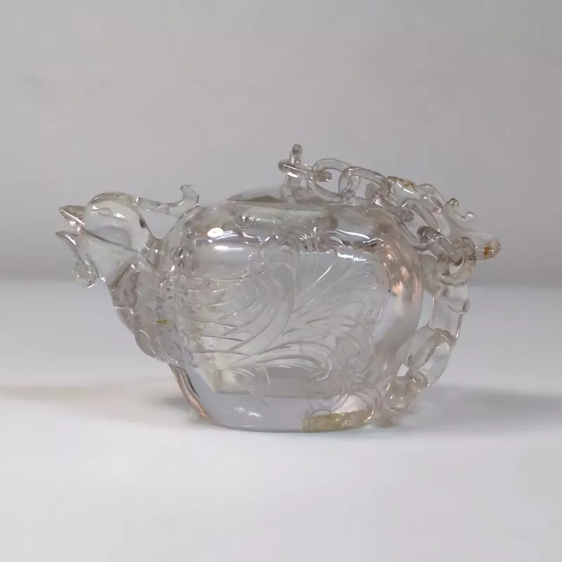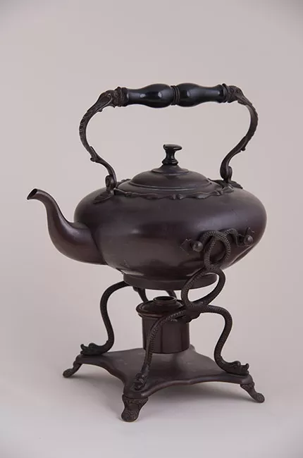 Objeto de forma globular con cuello curvo, pico largo y curvado adosado al cuerpo, así como un asa vertical en su lado opuesto, tapa con agarradera esférica y cuatro patas pequeñas patas en la base.