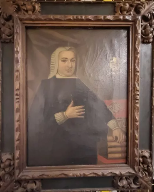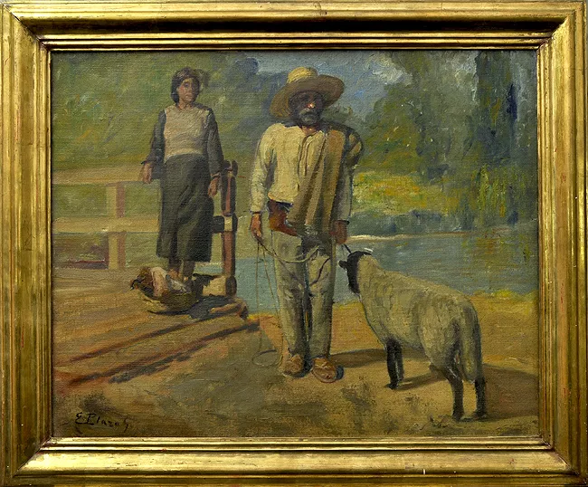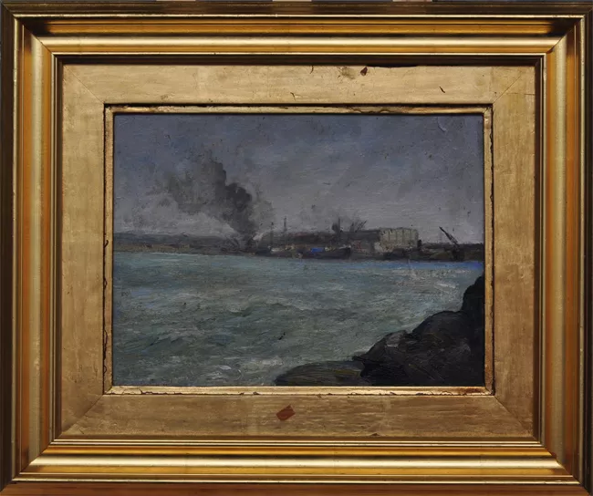 Obra de formato rectangular. En primer plano a la derecha rocas, a la ...