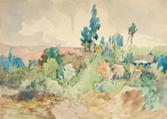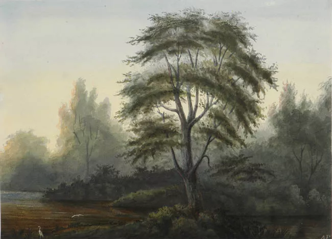 Composición que representa un paisaje natural. En primer plano un árbo...
