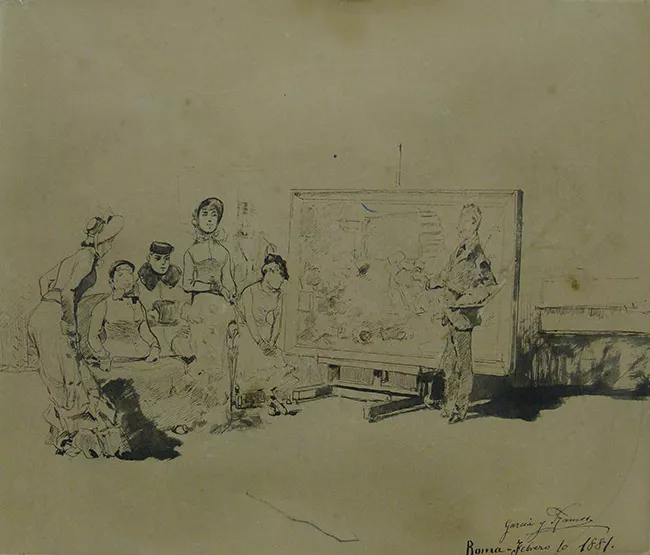 Dibujo a tinta coloreado con aguada de acuarela, que describe la entrada en arco con reja . Al costado derecho aparece un texto relacionado con el dibujo