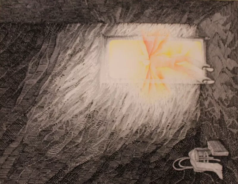Composición en formato rectangular, dispuesto verticalmente. Representa una figura femenina en medio cuerpo, con traje negro y capucha. La mujer presenta ceño fruncido.