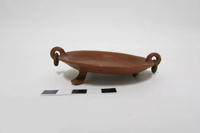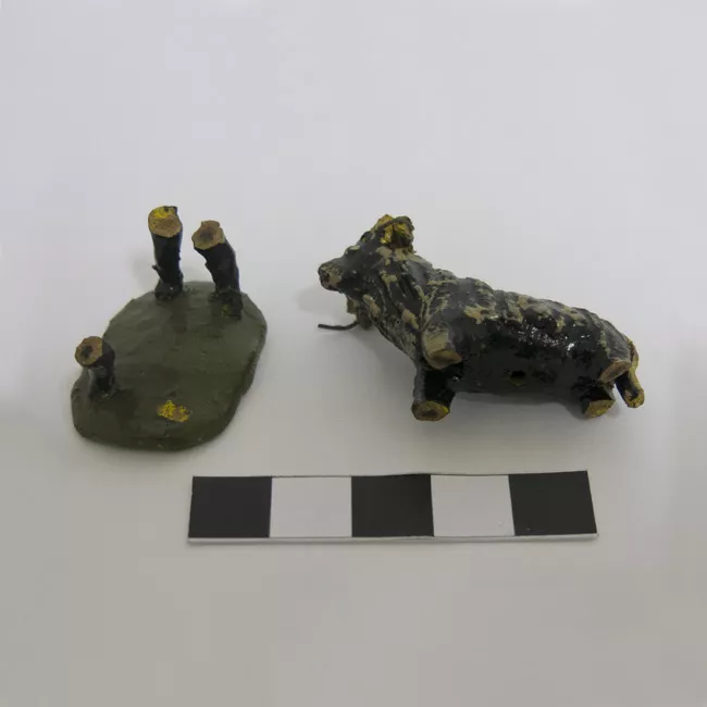 Objeto que representa un rostro tejido, con aspecto humano. Al extremo superior tiene un sombrero con borla. La base es una pieza trapezoide de color marrón y verde