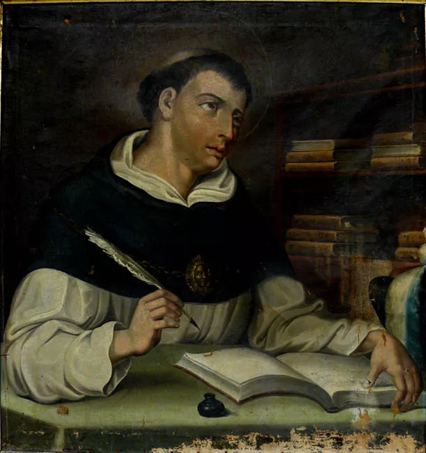 Obra visual de formato rectangular y disposición vertical, es un retrato masculino de pie y de cuerpo completo. Su rostro dirige la mirada hacia el frente; de ojos pequeños, semi calvo y con cabello, bigotes y barba marrón. La vestimenta es negra, con puños y cuello blanco, sobre el pecho una gran cruz de color rojo. En su mano derecha sostiene un sombrero, mientras que la mano izquierda se encuentra apoyada en sobre la empuñadura de una espada que prende de su cintura. Al costado izquierdo del personaje se ubica una mesa con mantel blanco sobre la cual se dispone un tintero con una pluma junto a otros elementos. Tras el personaje un cortinaje de color rojo.