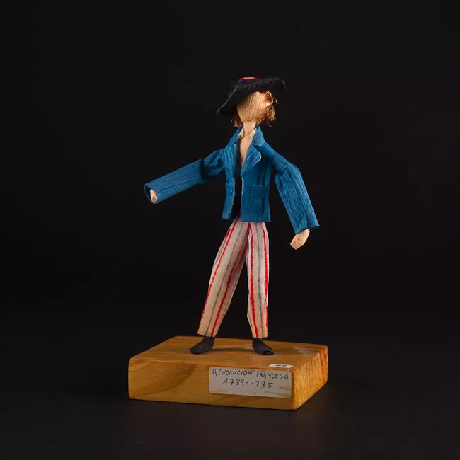 Objeto tridimensional, que representa una escena marítima, cuya figura principal es un barco de color negro, de tipo galeón, donde destacan tres mástiles que muestran sus velas recogidas. Por delante de la embarcación, se observa un muelle elaborado en madera y sobre el cual hay 19 representaciones de figuras antropomorfas, dispuestas en distintos puntos de la escena, en la cual se observan además tres grupos de barriles distribuidos en el muelle. El muelle y el barco están dispuestos sobre una base de madera que está pintada en colores azul marino principalmente, pero con toques de azul claro y blanco, con una capa de barniz brillante, que le confiere aspecto de agua.