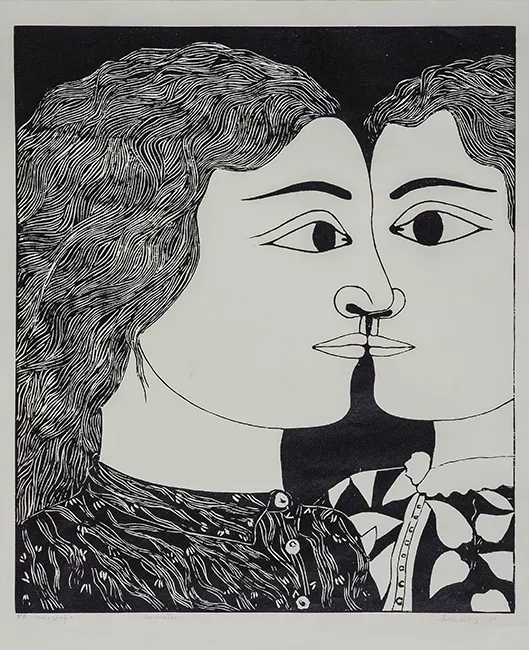 Composición en base a dos figuras humanas de frente y postura en quiasmo. Al lado izquierdo, aparece un hombre con taparrabos color blanco y capa roja. El personaje sostiene un arco que se apoya en el suelo con su mano derecha, y con su mano izquierda empuña una flecha. El personaje calza botines anaranjados, cabello recogido y bigote. Al lado izquierdo de la composición aparece una figura femenina de larga cabellera, con torso desnudo y pollera amarilla con pliegues. Desde un cinturón negro se desprende una capa morada que cubre su brazo izquierdo, donde lleva una cesta con pescados. La mujer calza botines anaranjados, y en su mano derecha sostiene un pescado. Ambos personajes presentan diseños geométricos en todo su cuerpo.