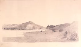 Dibujo monocromo que representa una vista de una bahía. En la zona der...
