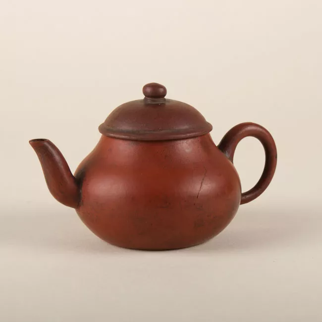Objeto de uso decorativo, es una representación de una tetera en pequeñas dimensiones. Está realizada en cerámica, se compone por un contenedor globular con un asa redondeada en la parte superior y un pico en la parte opuesta. Es de color rosado con decoraciones doradas y celestes.