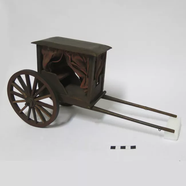 Objeto decorativo de cerámica esmaltada. La pieza consiste en una figura masculina de pie, viste una chaqueta y pantalón de color marrón y zapatos negros. En la mano izquierda de la figura tiene su sombrero de color marrón, la otra mano la tiene levantada a la altura de su rostro.