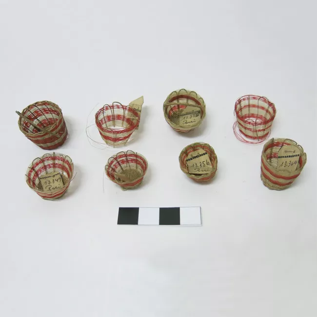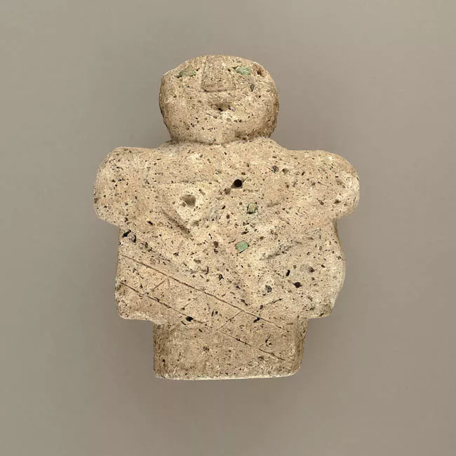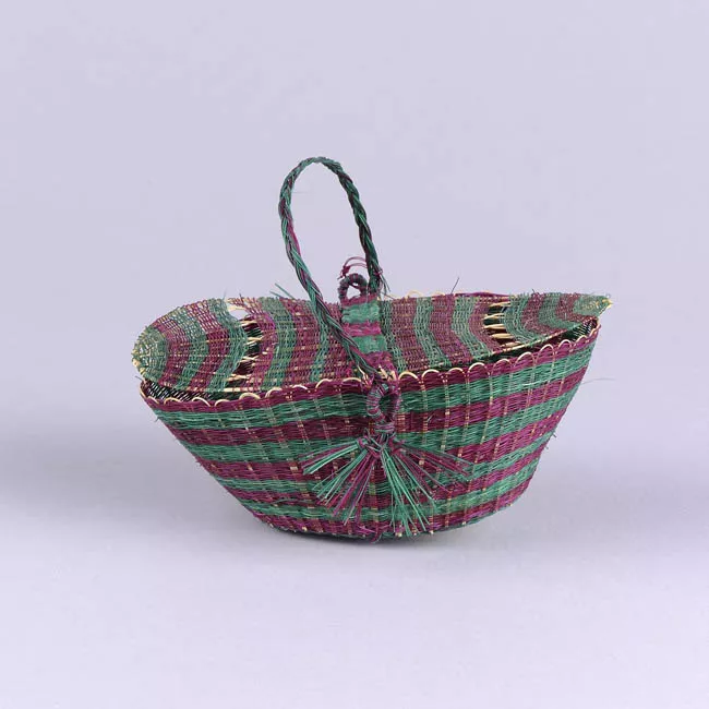 Objeto decorativo de cerámica esmaltada. La pieza consiste en dos figuras antropomorfas masculina y femenina sedentes ambas. La figura femenina sostiene un instrumento musical y viste un vestido con motivos vegetales, la figura masculina sostiene en su mano derecha una estructura circular con un recipiente al centro, ésta figura viste un traje de color negro y sombrero.