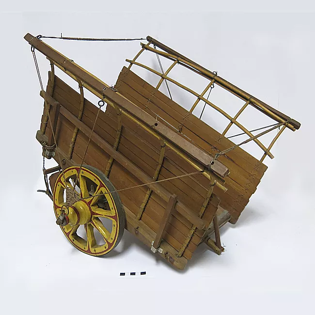 Objeto decorativo, reproduce una vasija cóncava doble en menor dimensión, de color rojo e interior amarillo. Al extremo superior presenta una amplia abertura circular y al extremo inferior se eleva sobre breves patas cónicas.