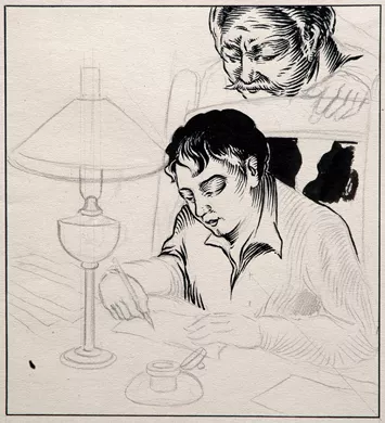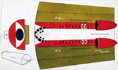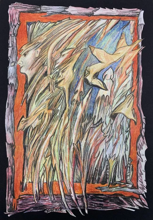 Dibujo de diversos personajes y un castillo. En la parte superior del dibujo se encuentra el castillo con cuatro niveles y tres torres adosadas. Posee el techo azul, y en el extremo izquierdo hay vegetación. En el extremo derecho superior un carruaje rojo tirado por caballos y escoltado por otros tres jinetes. En la parte media del dibujo dos mujeres vestidas a la usanza medieval saludan a un hombre de cabello amarillo y capa blanca, vestido de café; otro dibujo de un hombre vestido igual al anterior pero con un sombrero de mosquetero en la cabeza y con una pluma roja, está dibujado de frente. En la parte inferior derecha un hombre de cabello amarillo y vestido de negro está con una mujer con vestido rojo, blanco y amarillo; ella le toma la mano al hombre con su derecha mientras que la izquierda está sobre su vientre. La mujer tiene una serpiente en su cabeza.