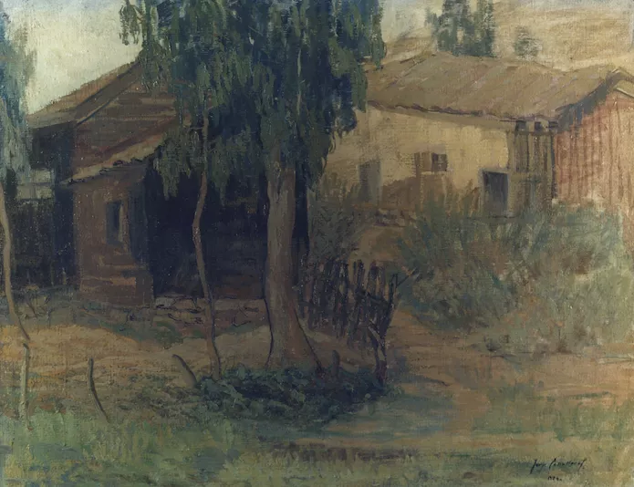 Obra de formato rectangular. Composición en base a paisaje rural. En p...