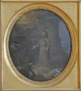 Obra visual de formato rectangular y disposición vertical; la composición es un retrato masculino de pie y tres cuartos de cuerpo, ubicado al centro de la obra; su rostro representa a un hombre que dirige la mirada al frente, tiene cabellos abundantes y patillas; presenta los brazos junto al cuerpo y sus mano izquierda junto al cinturón y la derecha sobre el torso, dentro de la chaqueta. Viste uniforme militar, con charreteras y galardones. Plano de fondo, representa un paisaje de perspectiva profunda con cerros y elevaciones.