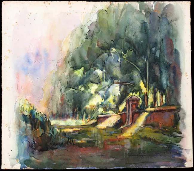 Composición en base a una vista panorámica de un paisaje. En primer plano, presenta una planicie color marrón. Segundo plano, casas, un edificio alto con torre apuntada rodeados de árboles. Tercer plano, mar y cielo. Manchas con predominio de los colores marrón, naranja y verde, mar y cielo color azul, violeta y amarillo sobre fondo blanco.Algunos contornos lineales color negro.